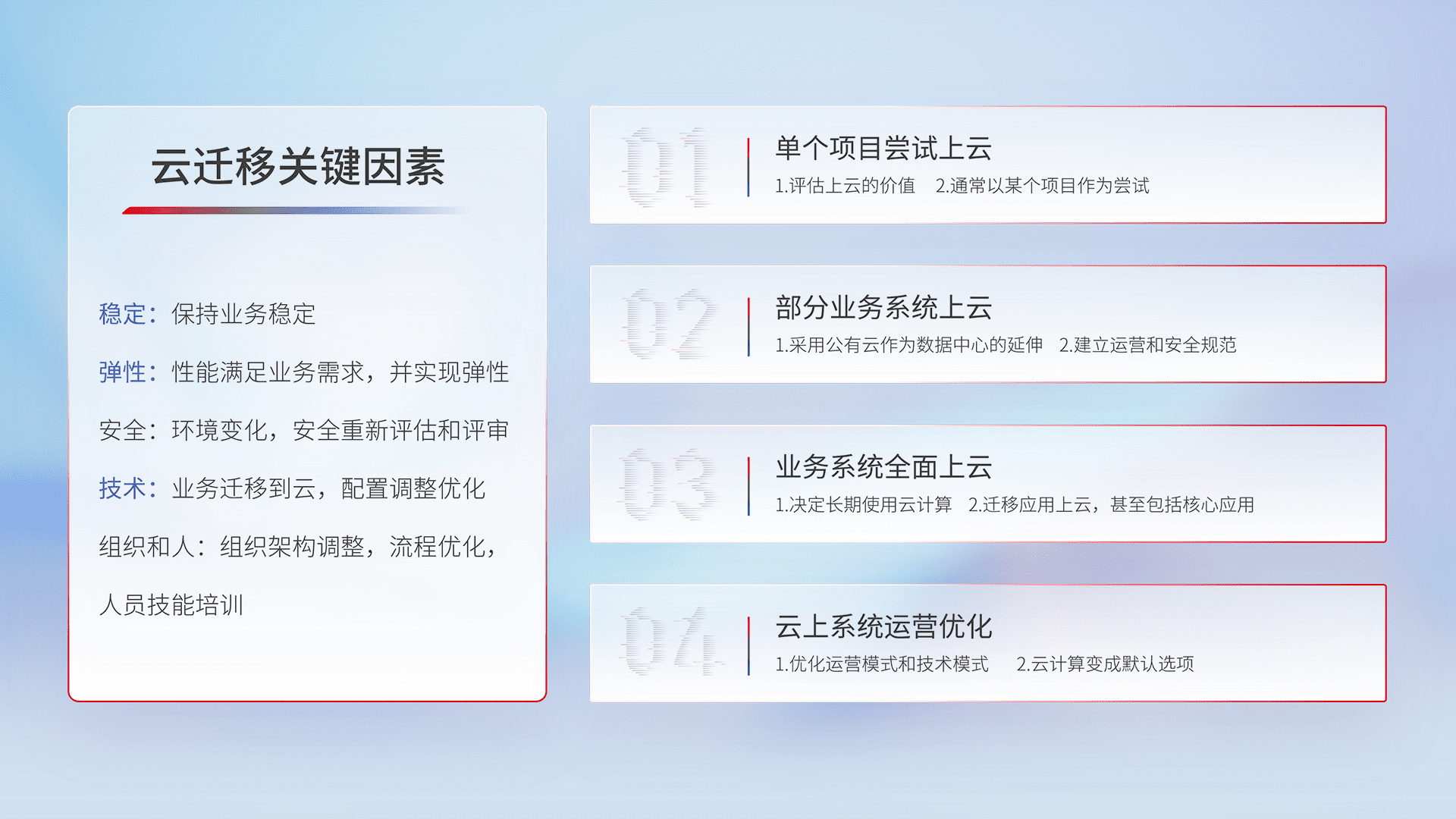 结合实际业务,,从规划设计、、、、云平台选型、、、、云原生改造、、数据迁移、、集成交付,,,,迁移全过程为客户识别最佳上云路径,,,,做好风险识别管理,,,,设计网络架构、、、、身份权限、、、安全审计合规、、、操作审计、、、日志审计、、监控告警策略、、多站点容灾设计等,,,对云上基础设施进行整体规划,,提升IT治理水平,,以满足弹性、、高可用、、、、高性能的需求。。。。