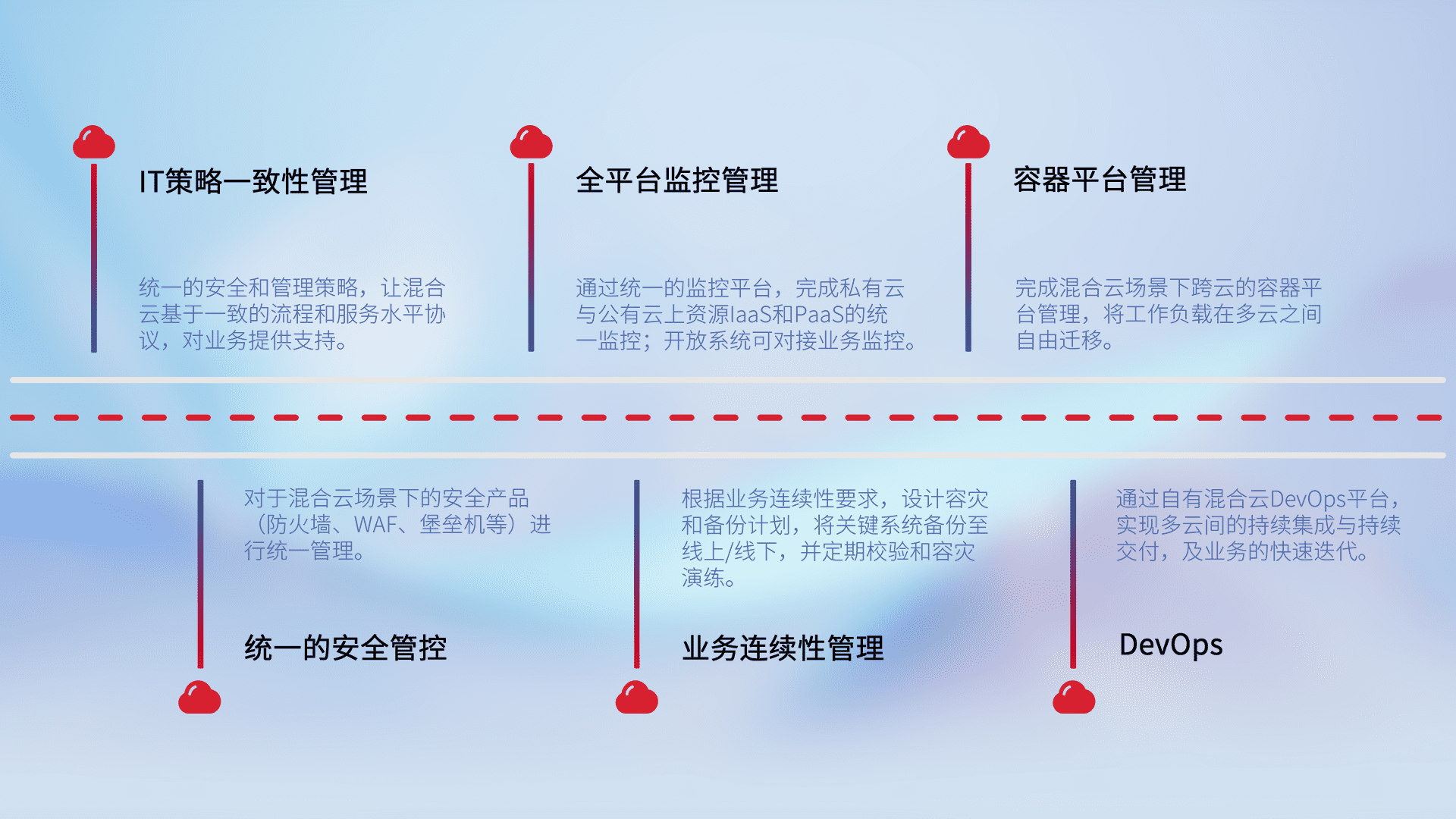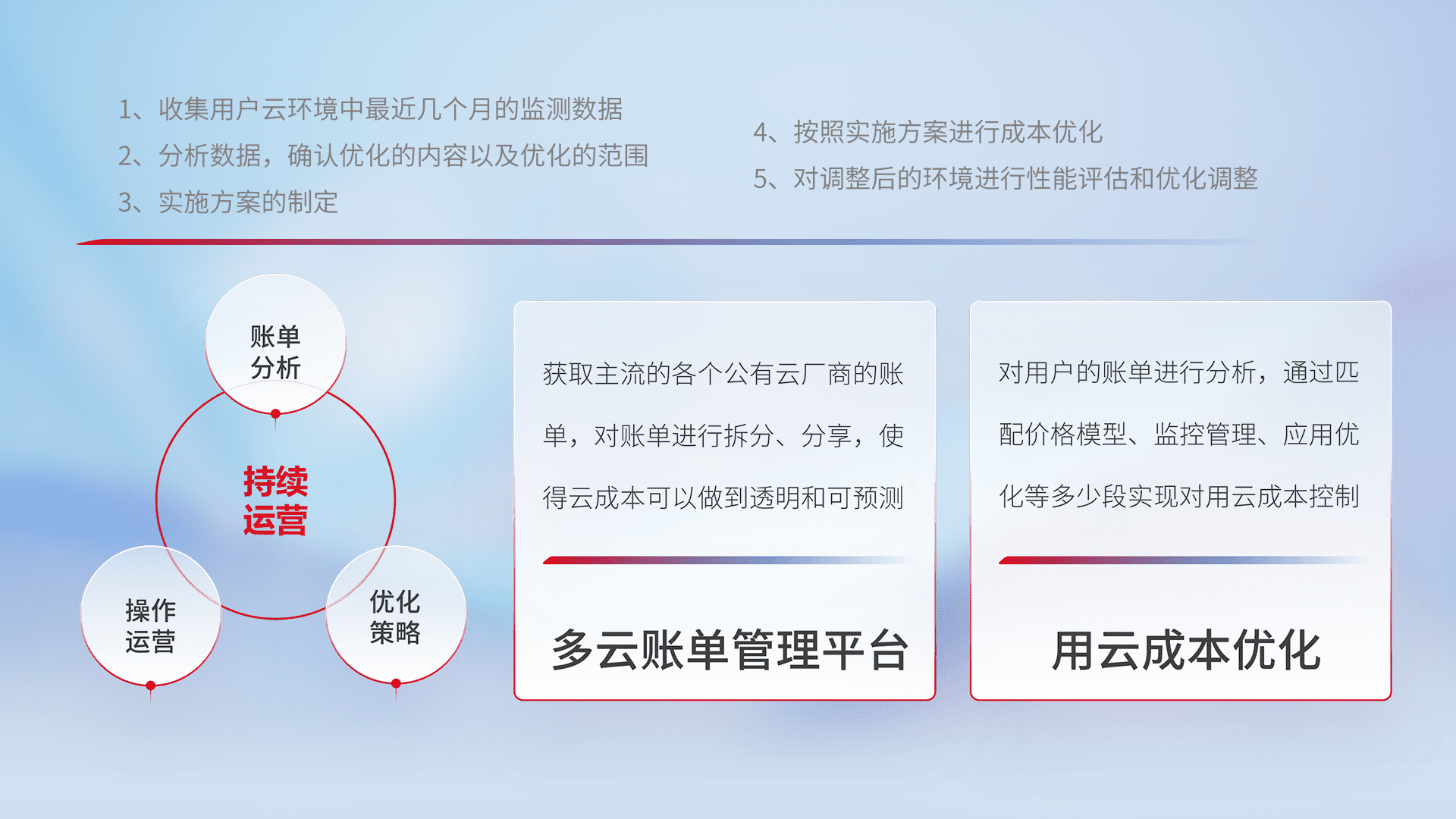 通过多云纳管,,,以统一的资源数据模型把客户的云资源进行抽象和封装,,进而实现对多云资源的统一操作,,,,保障云资源管理的可靠性、、、稳定性与可用性。。量身定制化运维内容,,,,配置、、、、开发运维、、、、补丁管理、、、、备份、、、、监控、、认证和访问管理、、、、审计和日常巡检等,,,,保障在用云过程中的可靠度,,稳定度以及高可用率。。。