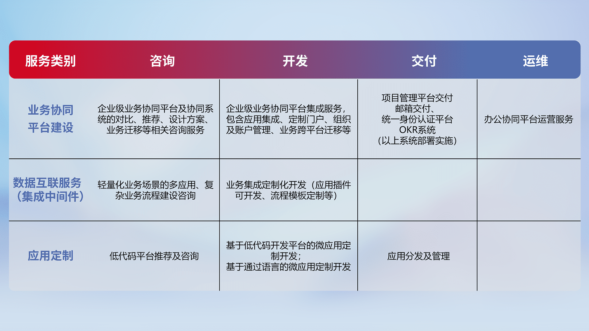 针对钉钉、、、、企微、、、、IDaas等平台级产品提供产品的规划、、方案、、交付、、定制化开发等服务,,实现如统一协同办公、、、、智能客户服务、、混合会议管理、、、智能数据查询、、、等业务场景,,实现数字化转型。。